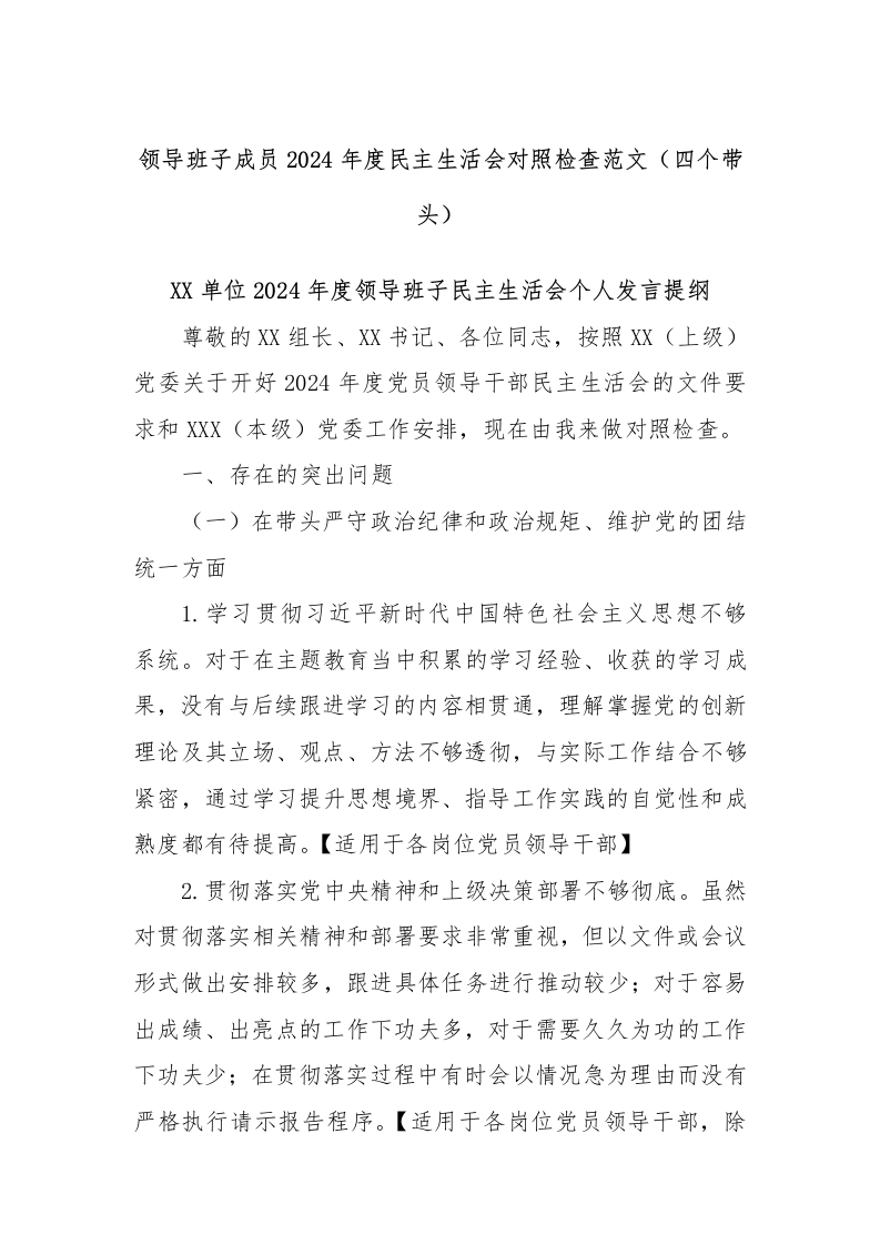领导班子成员2024年度民主生活会对照检查范文(四个带头)