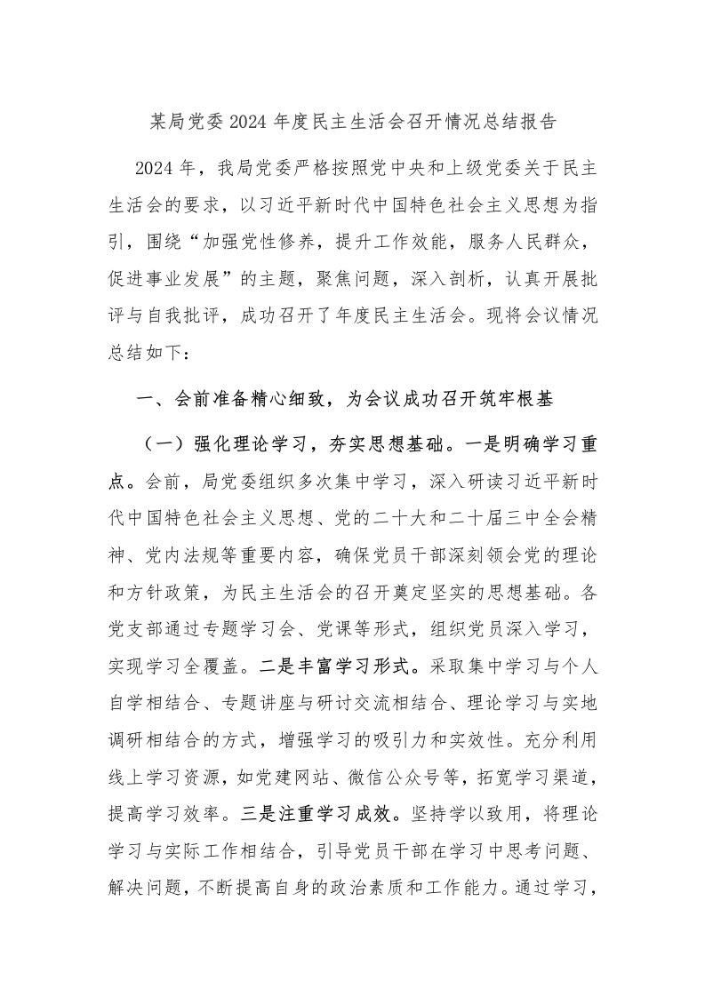 某局党委2024年度民主生活会召开情况总结报告