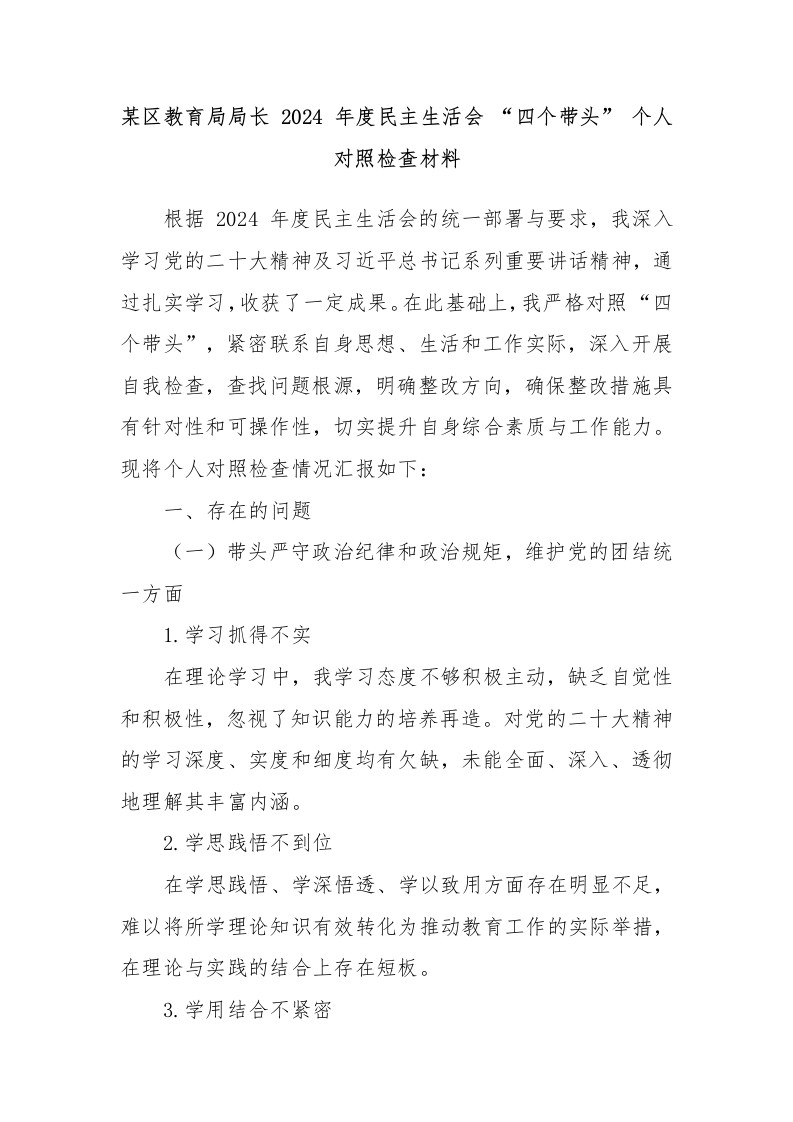 某区教育局局长 2024 年度民主生活会 “四个带头” 个人对照检查材料2docx