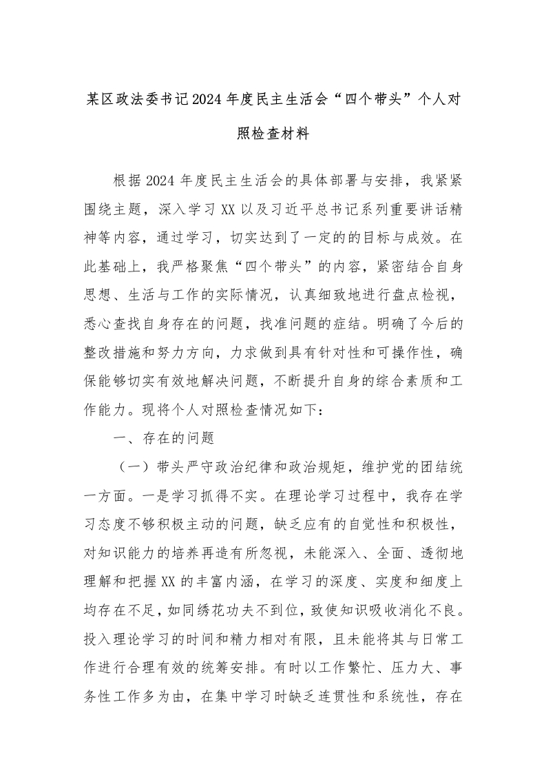 某区政法委书记2024年度民主生活会“四个带头”个人对照检查材料