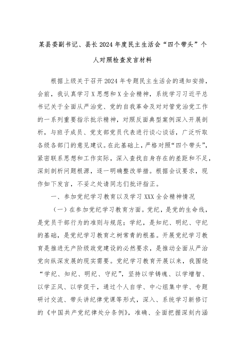 某县委副书记、县长2024年度民主生活会“四个带头”个人对照检查发言材料