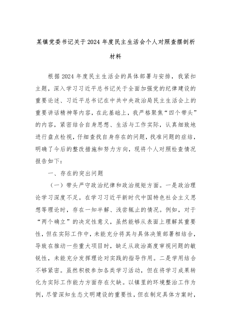 某镇党委书记关于2024年度民主生活会个人对照查摆剖析材料