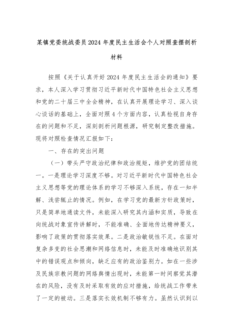 某镇党委统战委员2024年度民主生活会个人对照查摆剖析材料