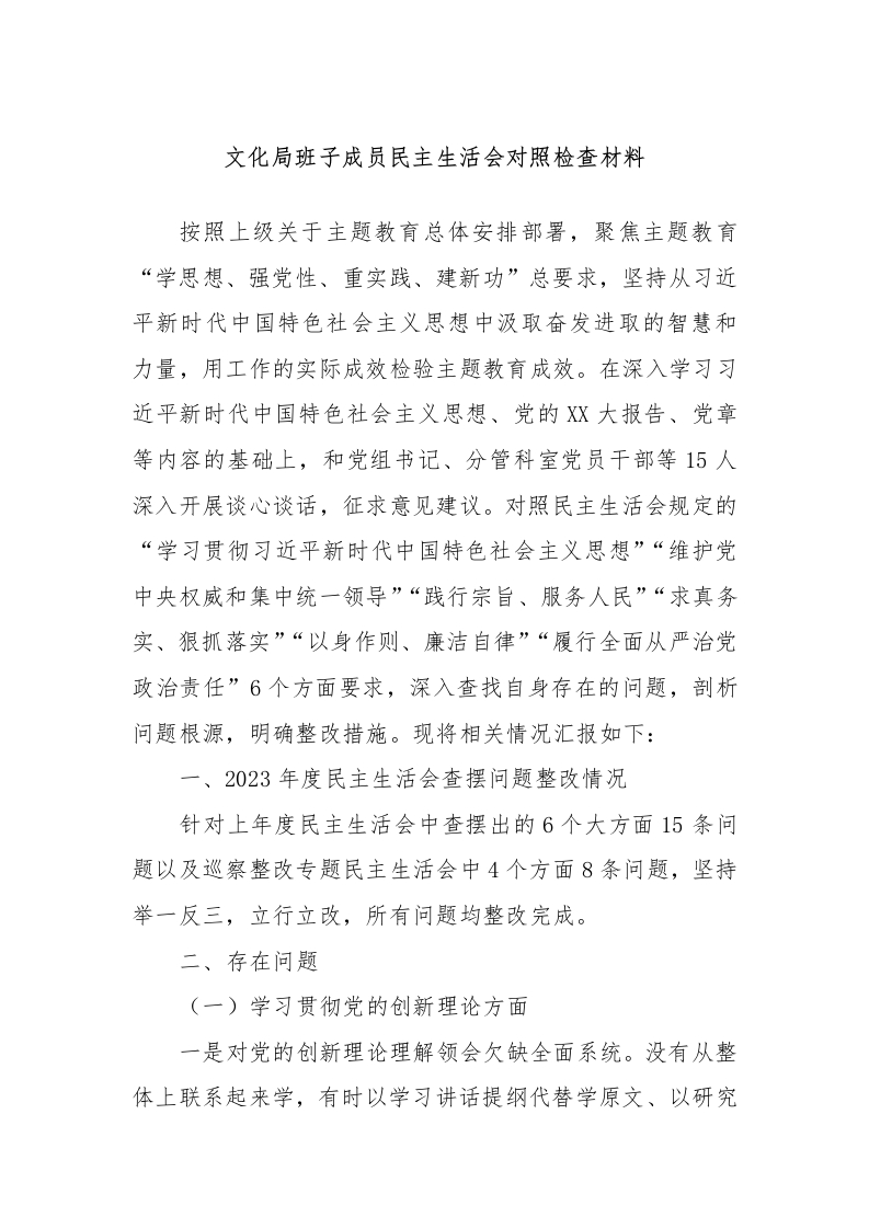 文化局班子成员民主生活会对照检查材料