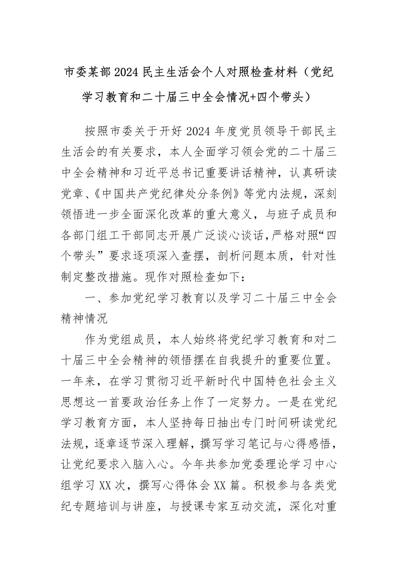 首页公文大全民主生活会市委某部2024民主生活会个人对照检查材料(党纪学习教育和二十届三中全会情况+四个带头)