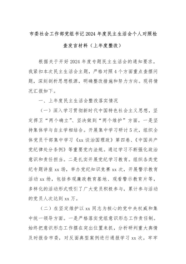 市委社会工作部党组书记2024年度民主生活会个人对照检查发言材料(上年度整改)