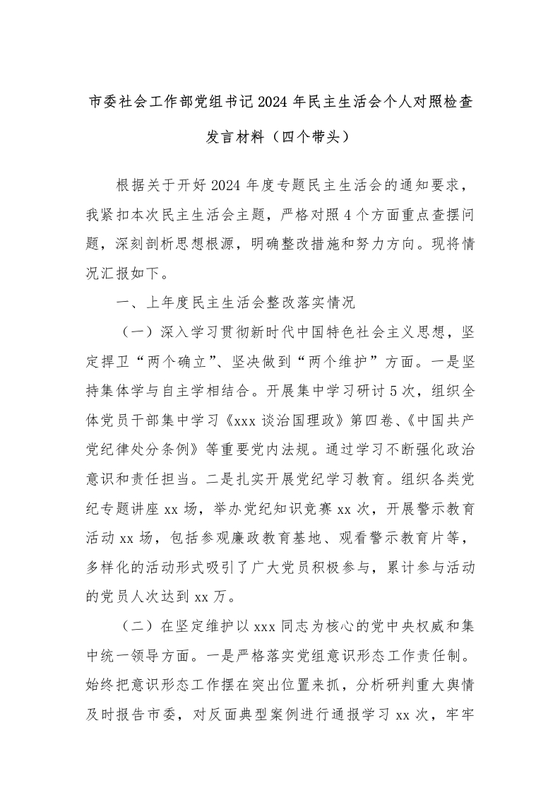 首页公文大全民主生活会市委社会工作部党组书记2024年民主生活会个人对照检查发言材料(四个带头)