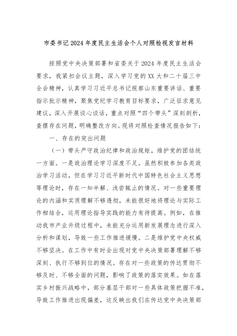 首页公文大全民主生活会市委书记2024年度民主生活会个人对照检视发言材料