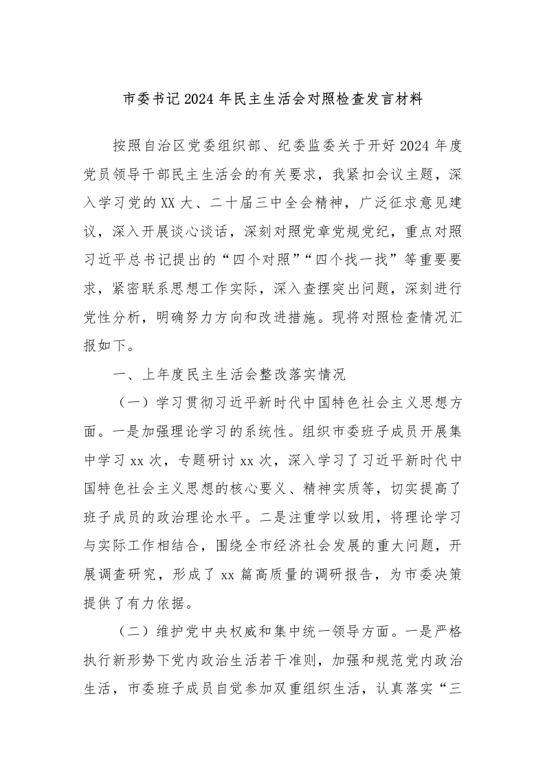 首页公文大全民主生活会市委书记2024年民主生活会对照检查发言材料