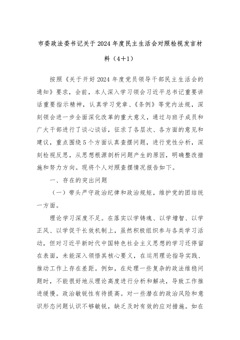 市委政法委书记关于2024年度民主生活会对照检视发言材料(4+1)