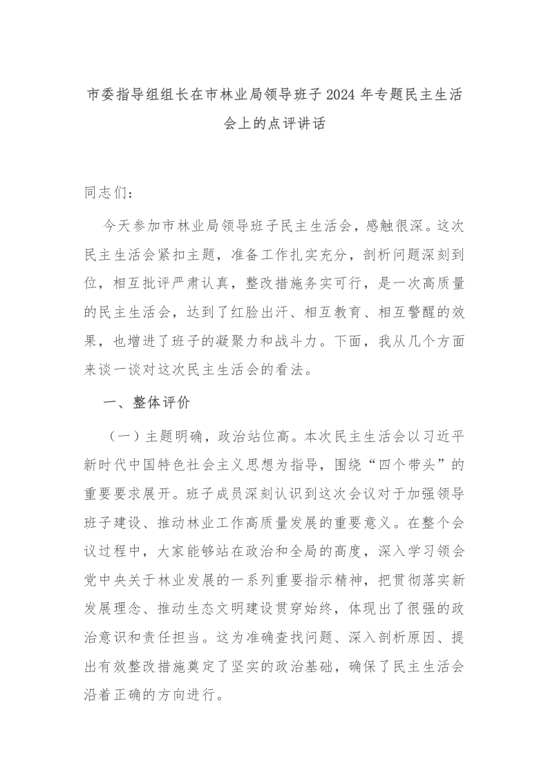 市委指导组组长在市林业局领导班子2024年专题民主生活会上的点评讲话