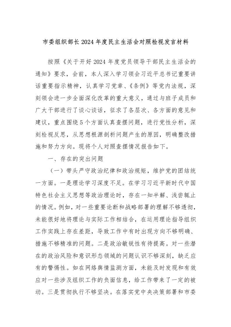 首页公文大全民主生活会市委组织部长2024年度民主生活会对照检视发言材料