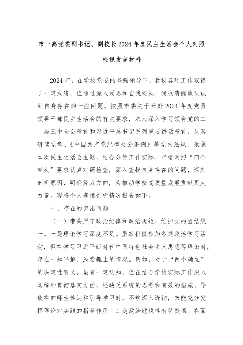 市一高党委副书记、副校长2024年度民主生活会个人对照检视发言材料