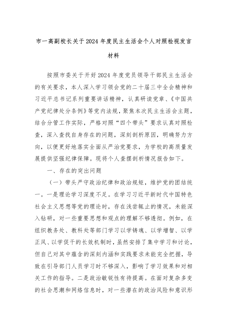 市一高副校长关于2024年度民主生活会个人对照检视发言材料