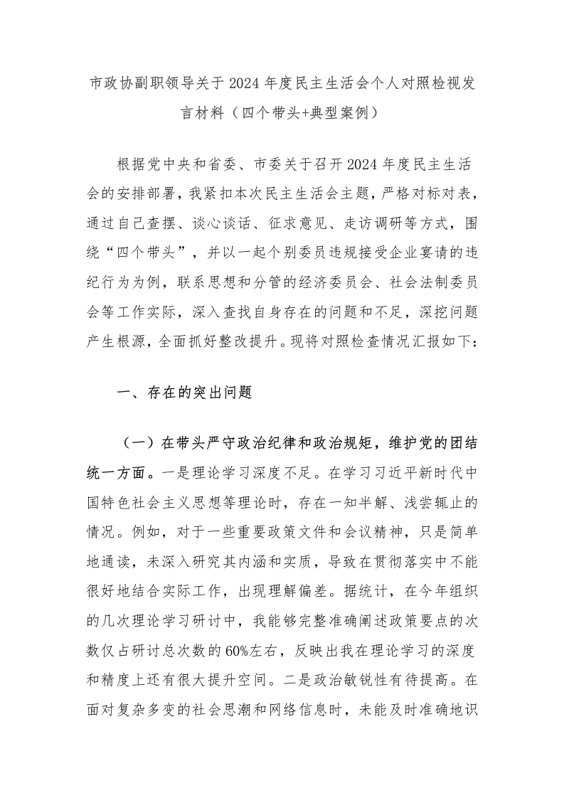 市政协副职领导关于2024年度民主生活会个人对照检视发言材料(四个带头+典型案例)