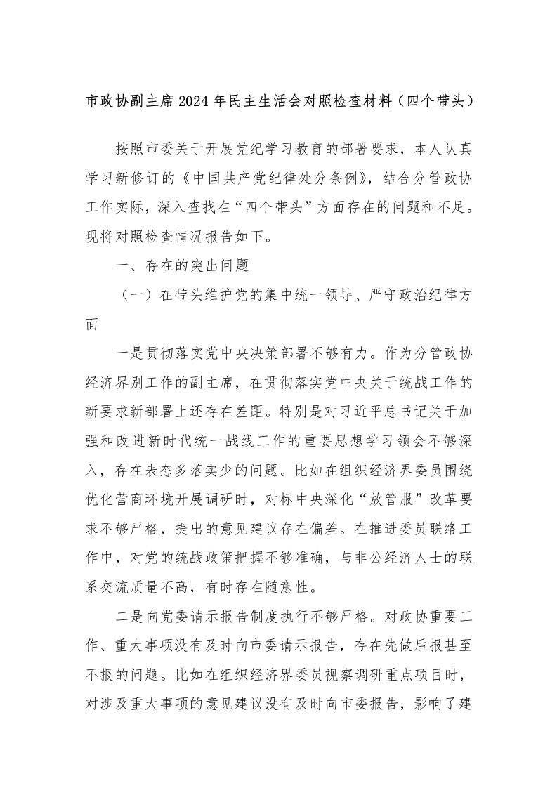 市政协副主席2024年民主生活会对照检查材料(四个带头)