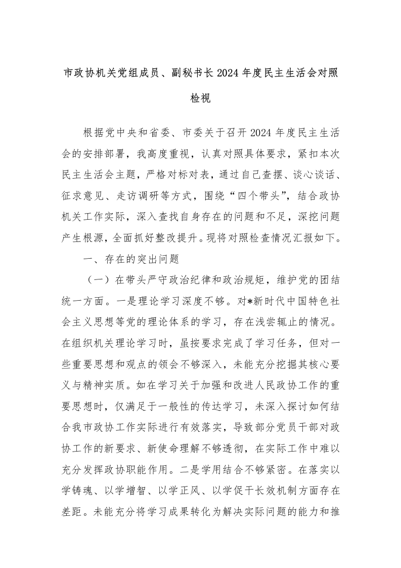 市政协机关党组成员、副秘书长2024年度民主生活会对照检视