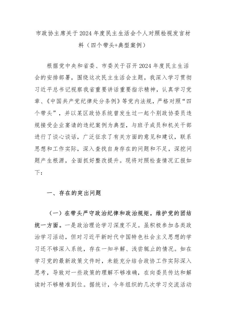 市政协主席关于2024年度民主生活会个人对照检视发言材料(四个带头+典型案例)