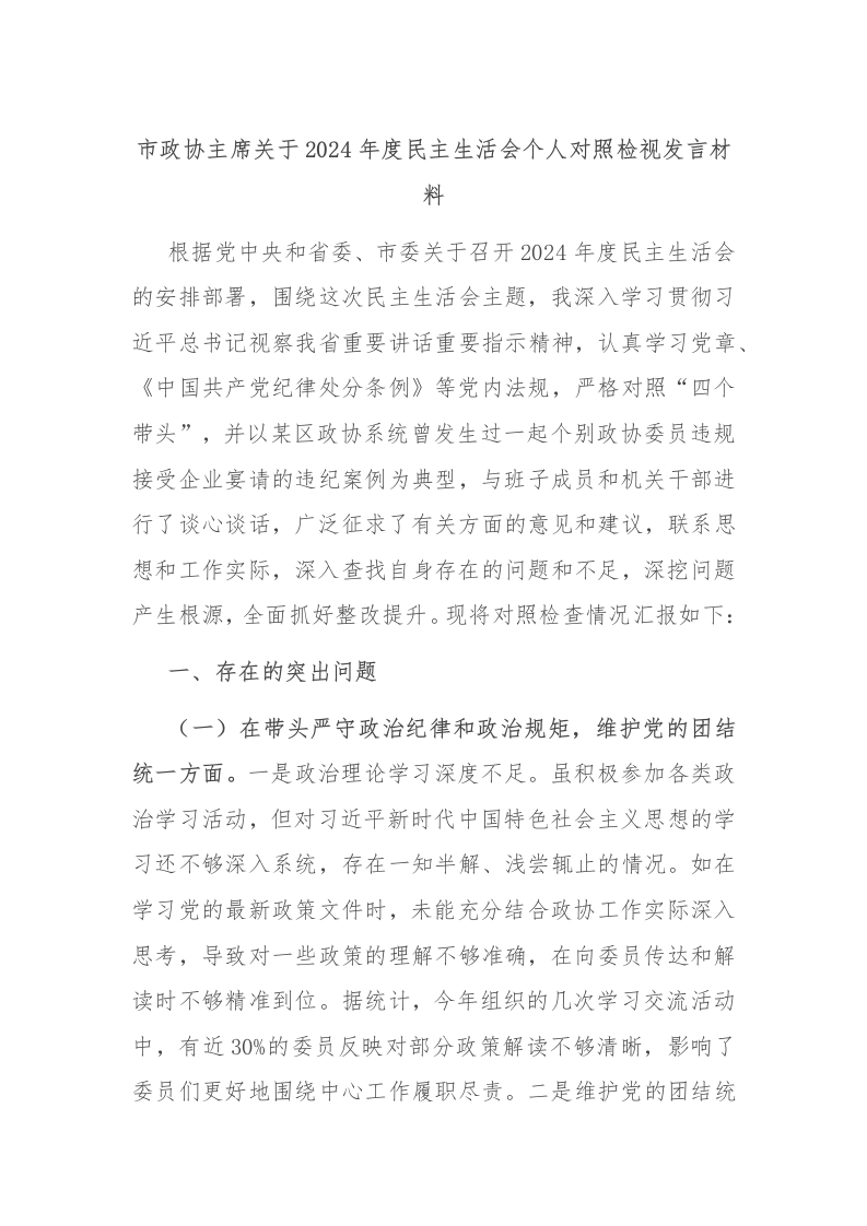 市政协主席关于2024年度民主生活会个人对照检视发言材料