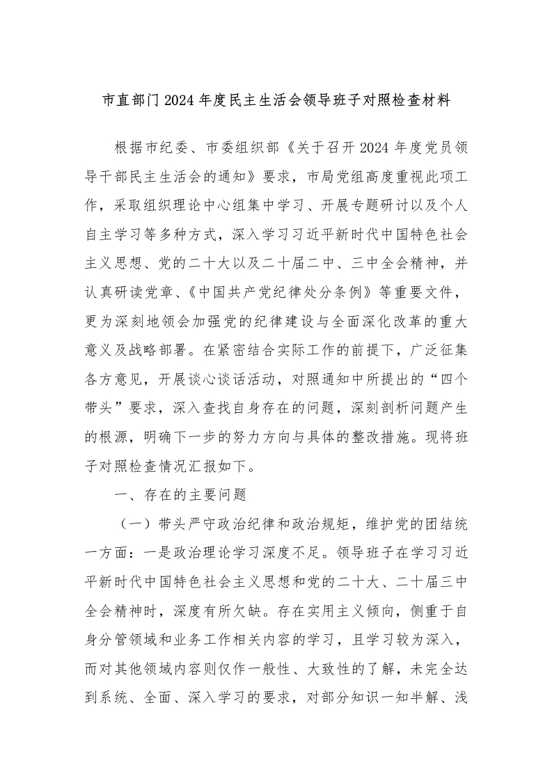 市直部门2024年度民主生活会领导班子对照检查材料