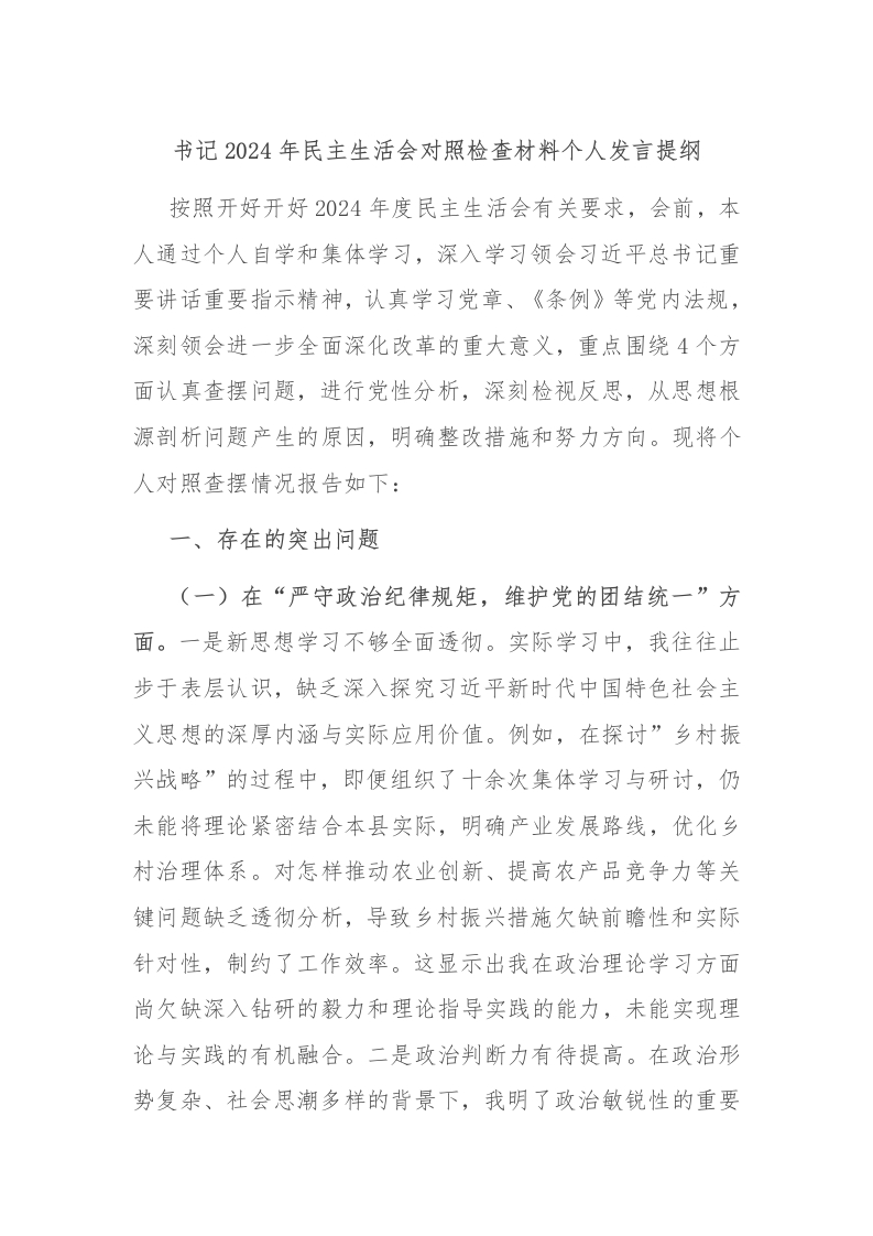 首页公文大全民主生活会书记2024年民主生活会对照检查材料个人发言提纲