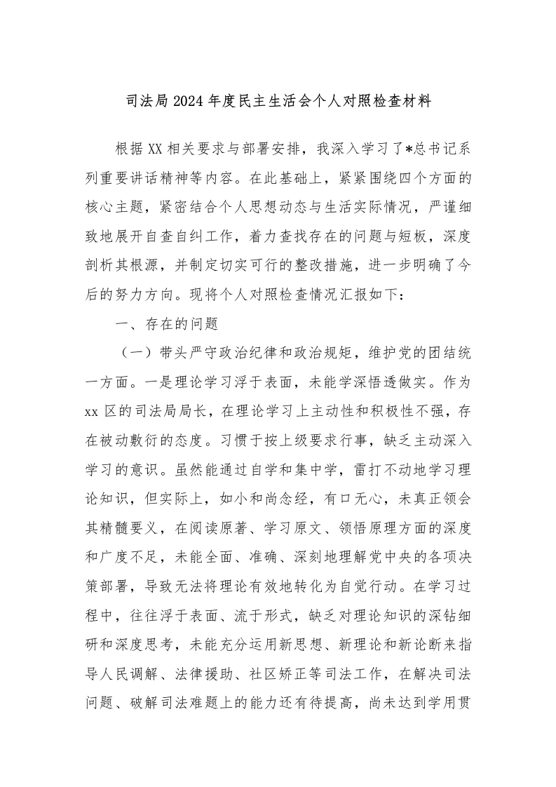 首页公文大全民主生活会司法局2024年度民主生活会个人对照检查材料