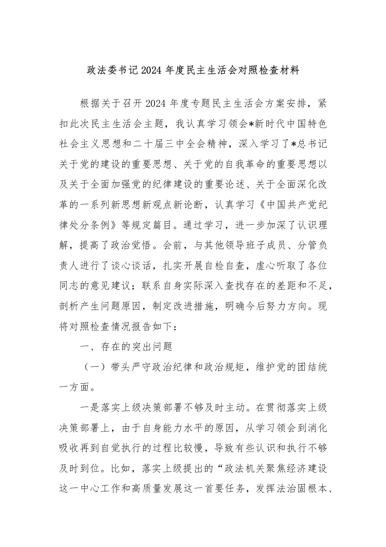 政法委书记2024年度民主生活会对照检查材料