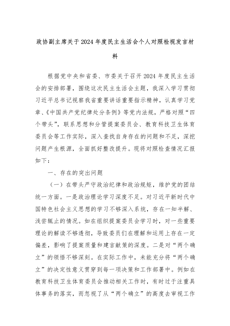 政协副主席关于2024年度民主生活会个人对照检视发言材料