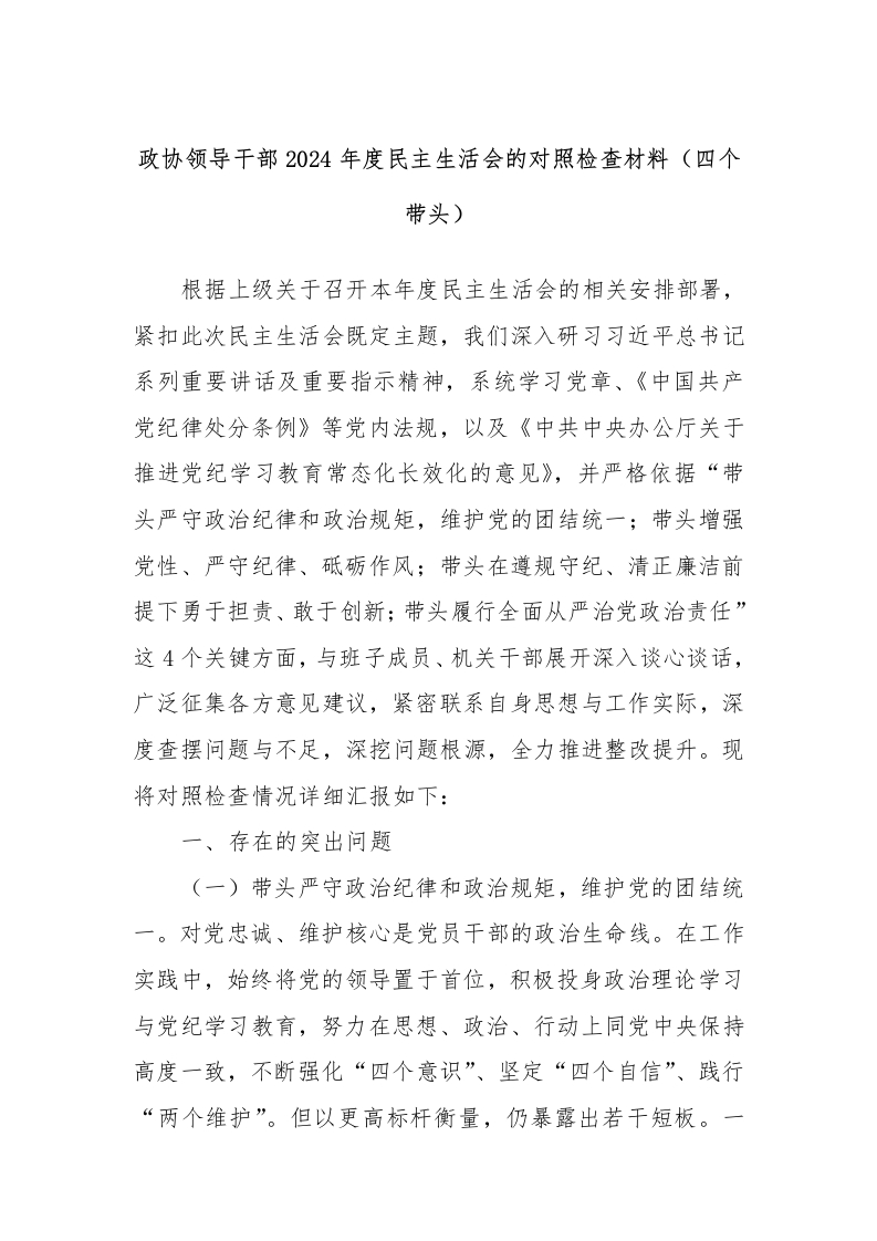 政协领导干部2024年度民主生活会的对照检查材料(四个带头)