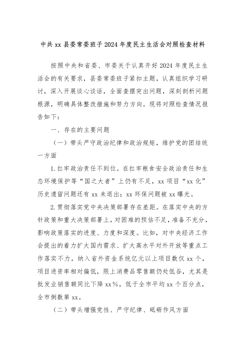 中共xx县委常委班子2024年度民主生活会对照检查材料