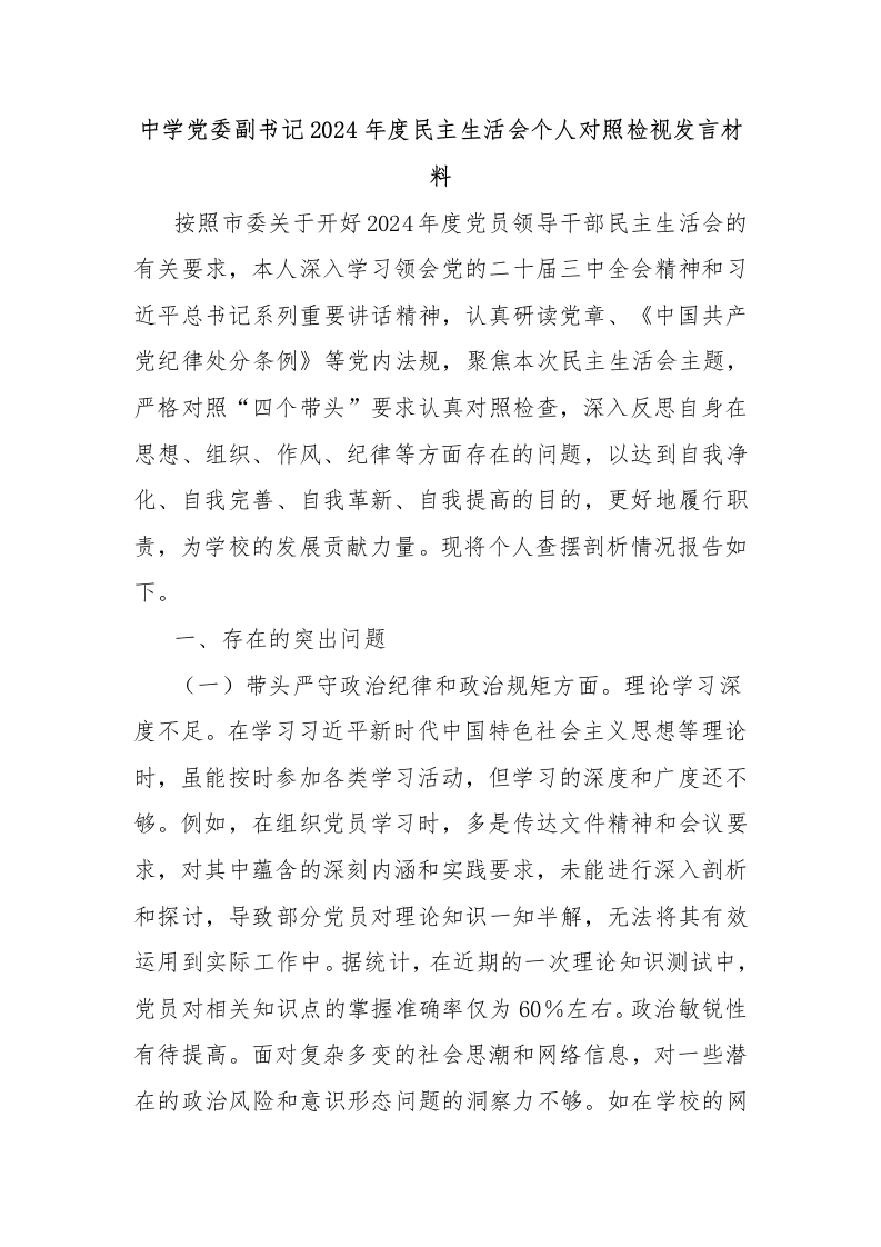 中学党委副书记2024年度民主生活会个人对照检视发言材料