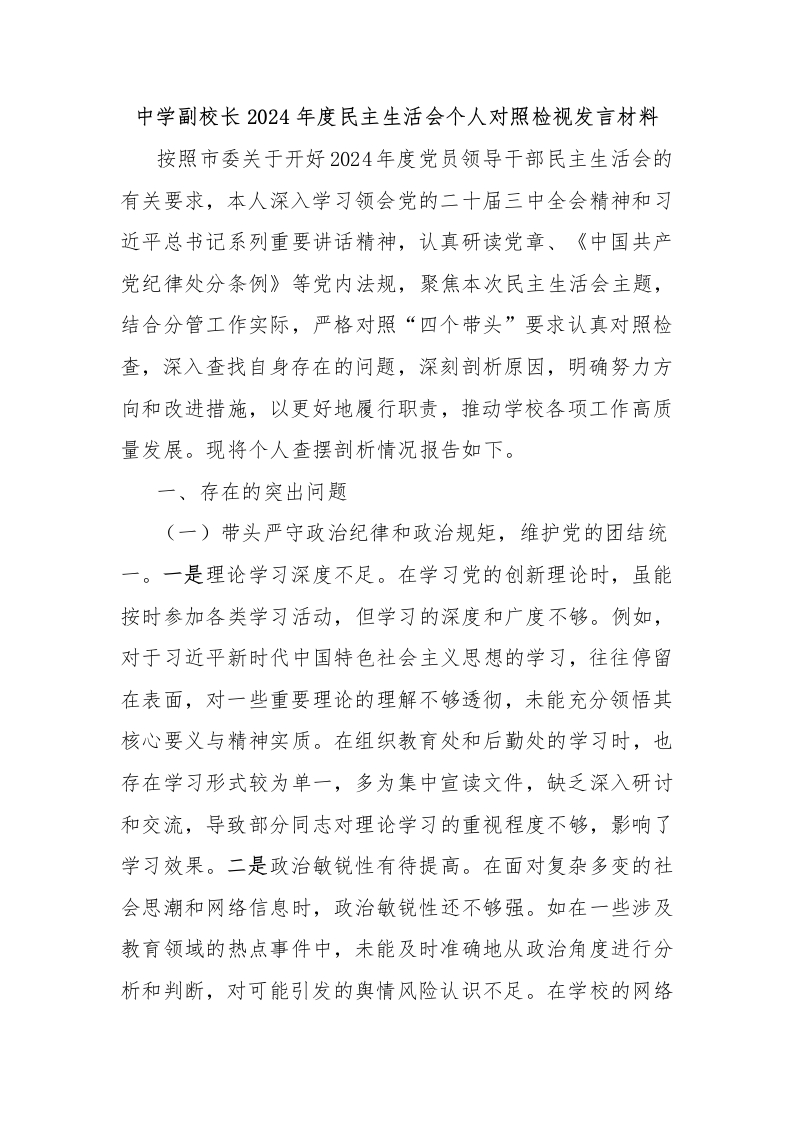 中学副校长2024年度民主生活会个人对照检视发言材料