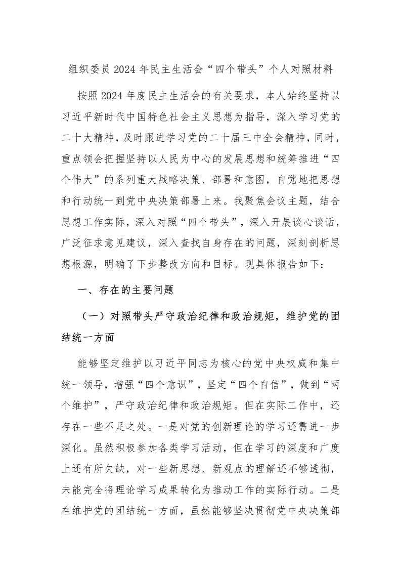 组织委员2024年民主生活会“四个带头”个人对照材料