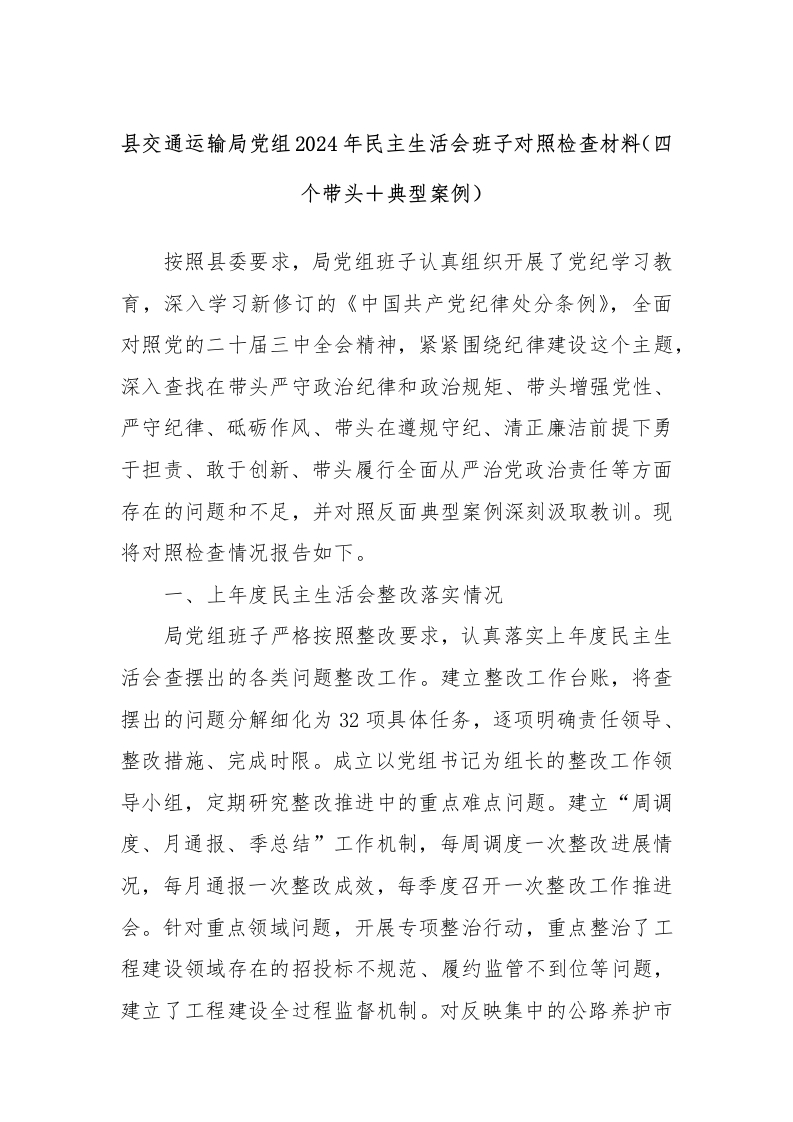 县交通运输局党组2024年民主生活会班子对照检查材料(四个带头+典型案例)