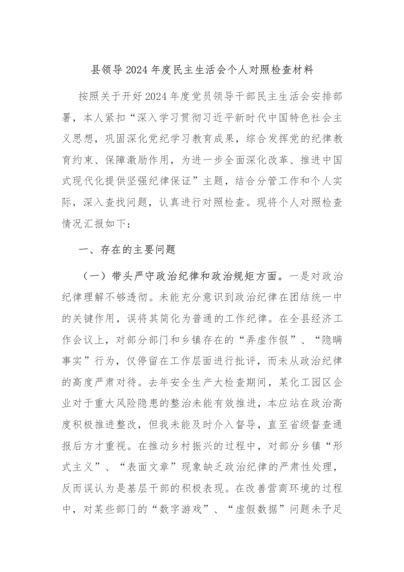 首页公文大全民主生活会县领导2024年度民主生活会个人对照检查材料