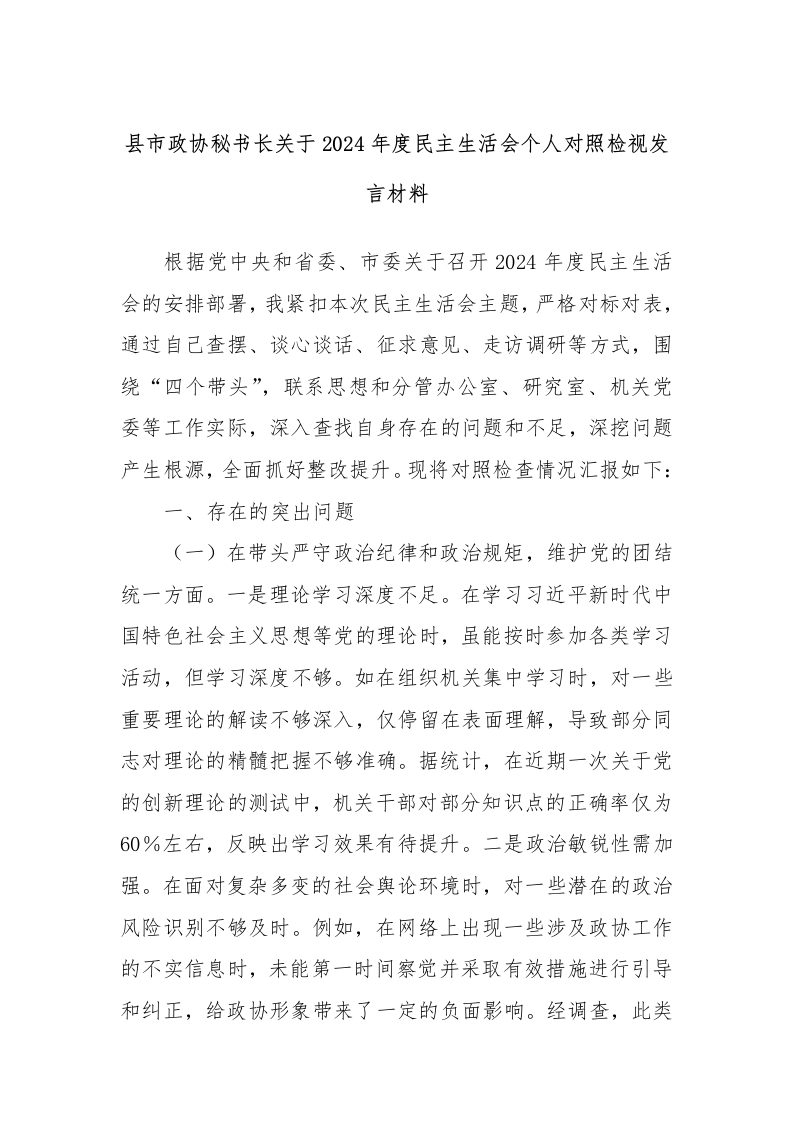 县市政协秘书长关于2024年度民主生活会个人对照检视发言材料