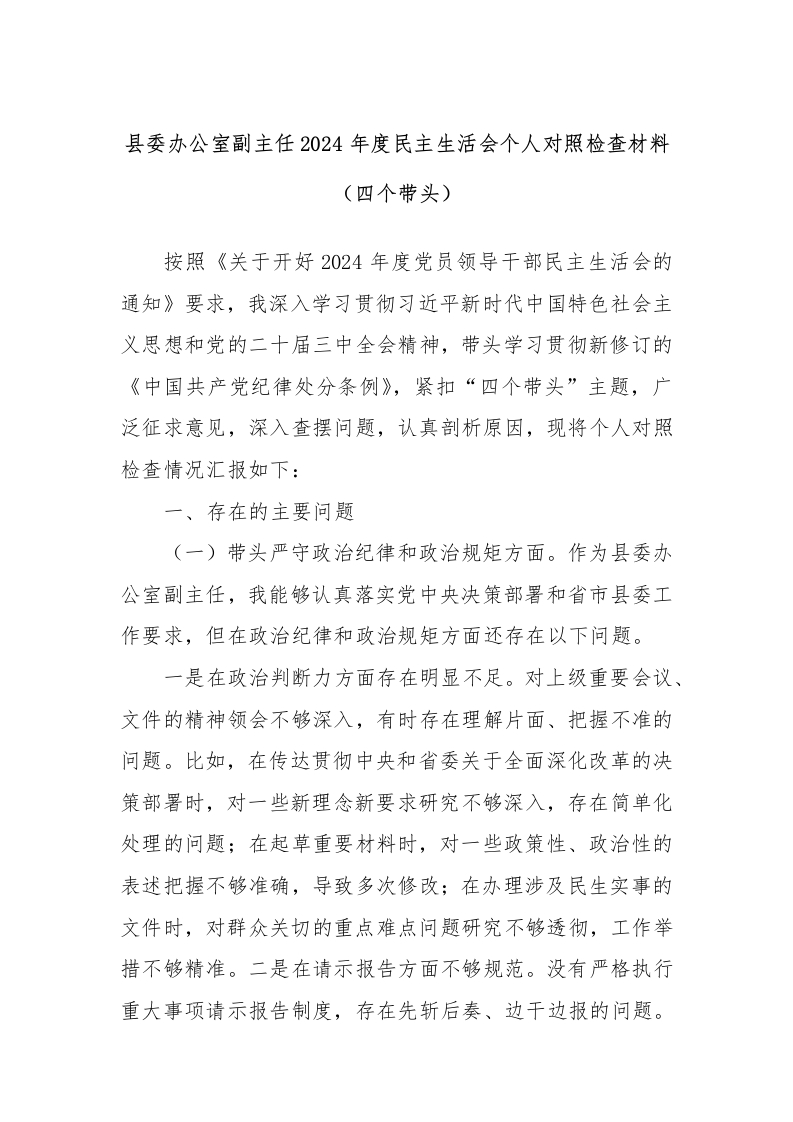 县委办公室副主任2024年度民主生活会个人对照检查材料(四个带头)